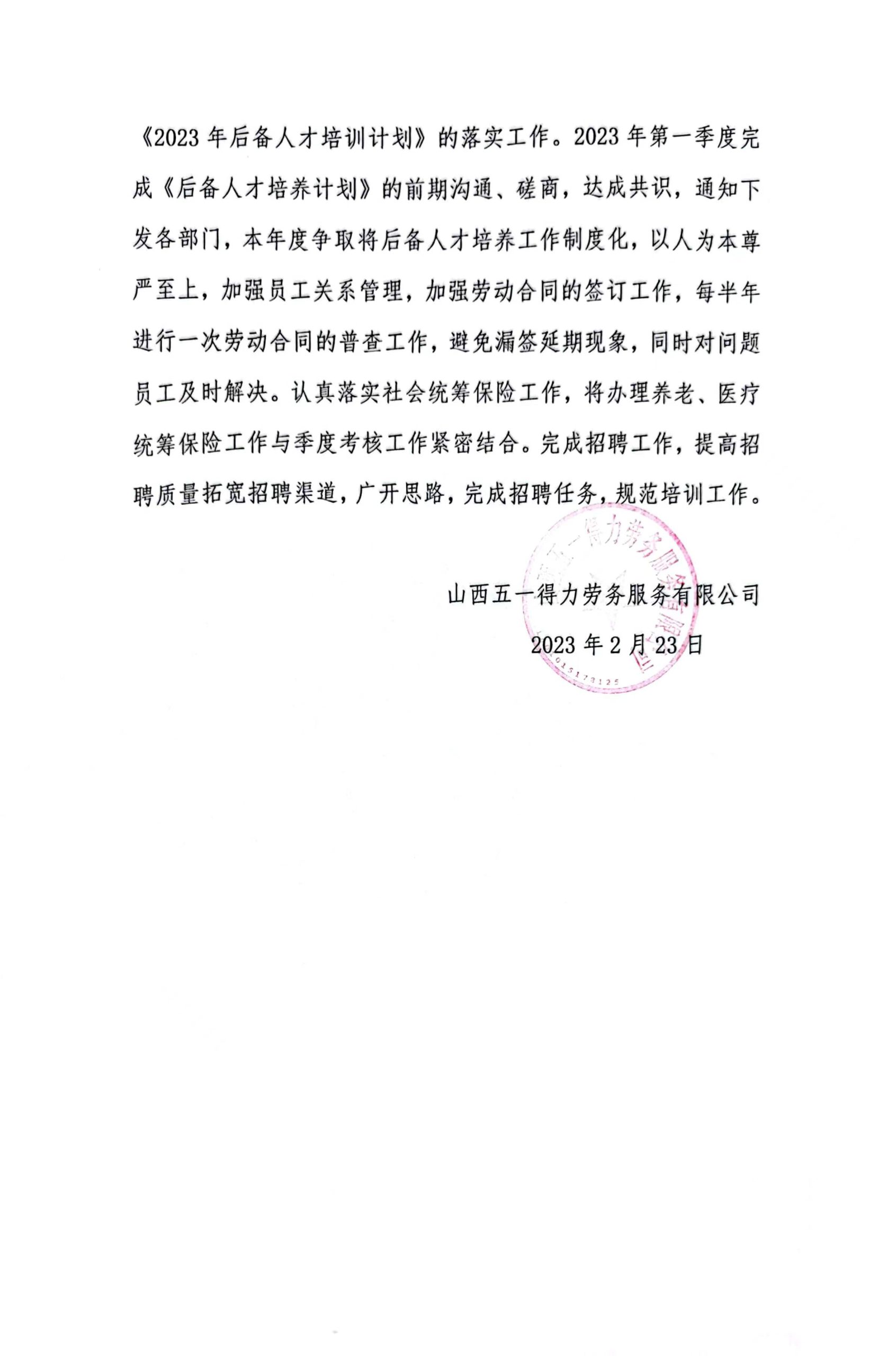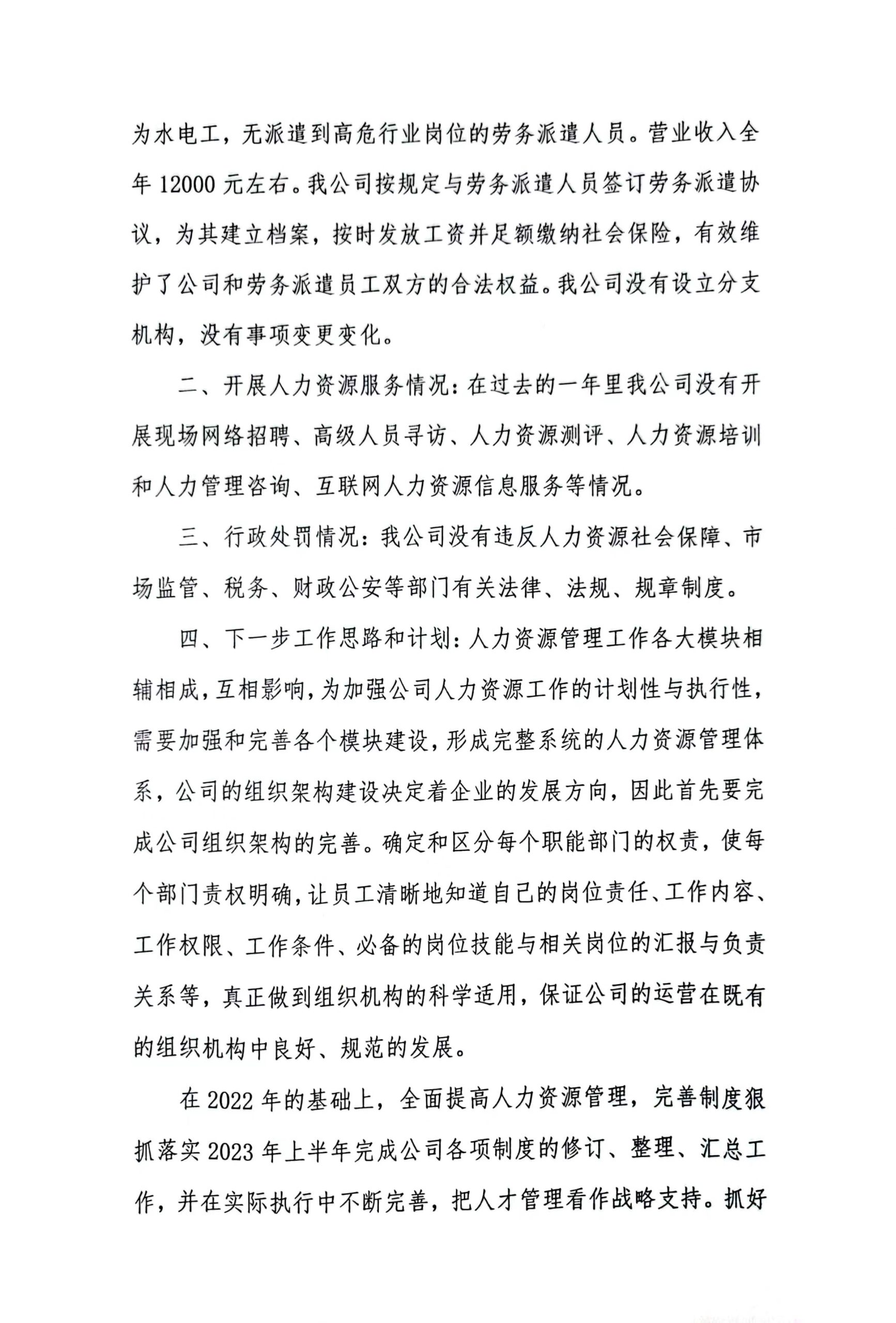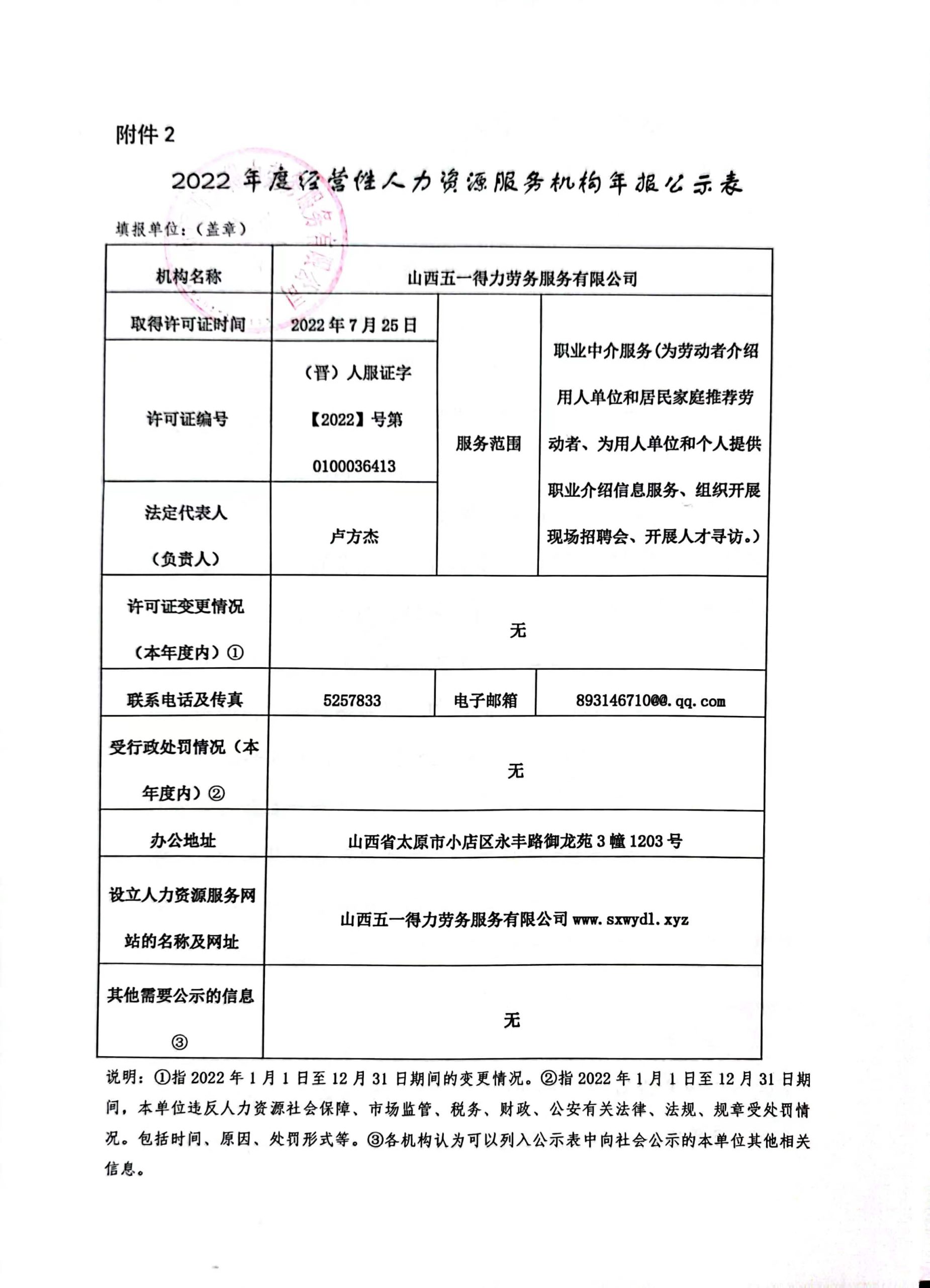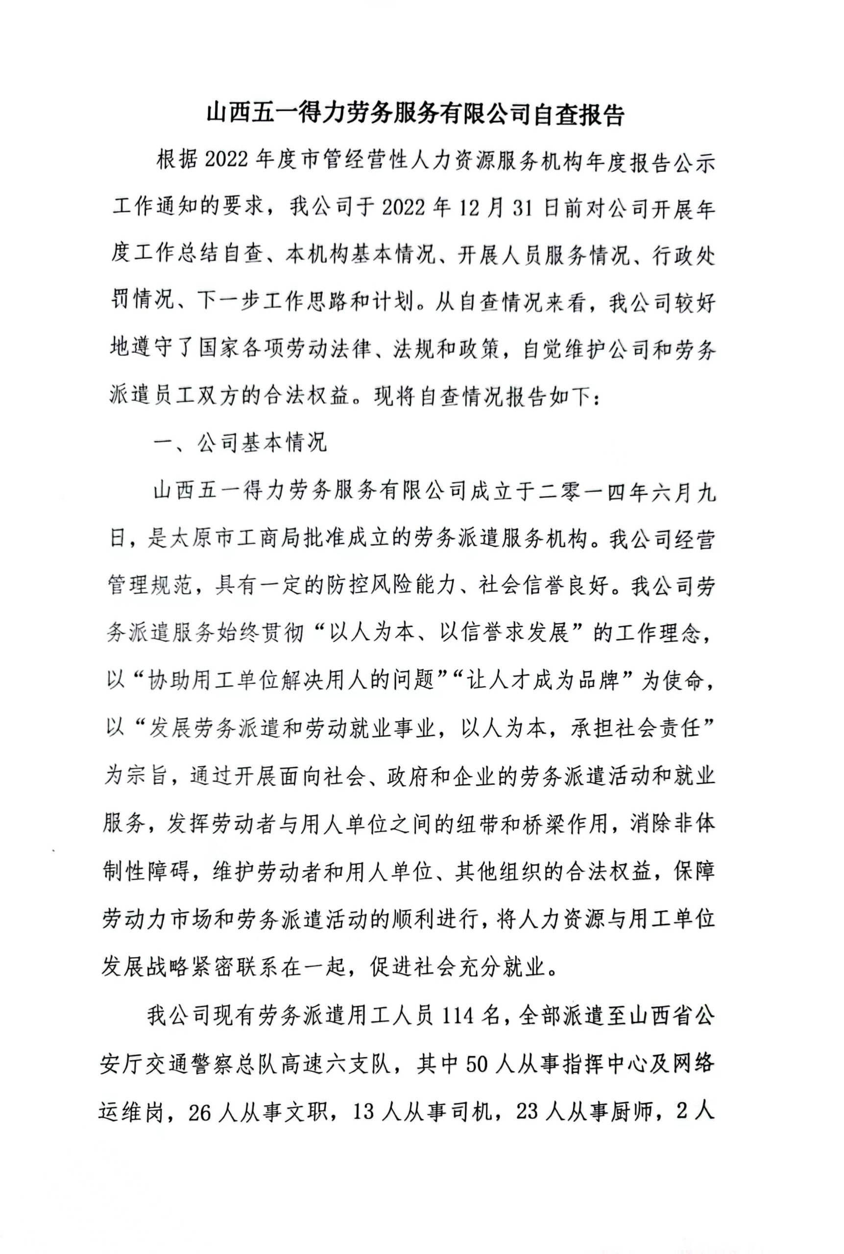 山西五一得力劳务服务有限公司于2022年12月31日前对公司展开年度工作总结自查,对本机构基本情况、人员服务情况、行政处罚情况进行了自查并制定下一步工作思路和计划。从自查情况来看,我公司较好地遵守了国家各项劳动法律、法规和政策,自觉维护公司和劳务派遣员工双方的合法权益。现将自查情况公示如下: