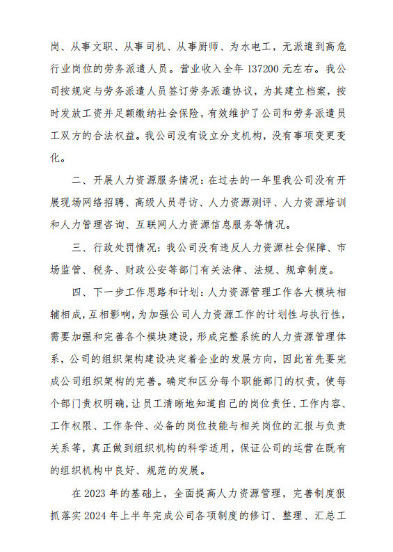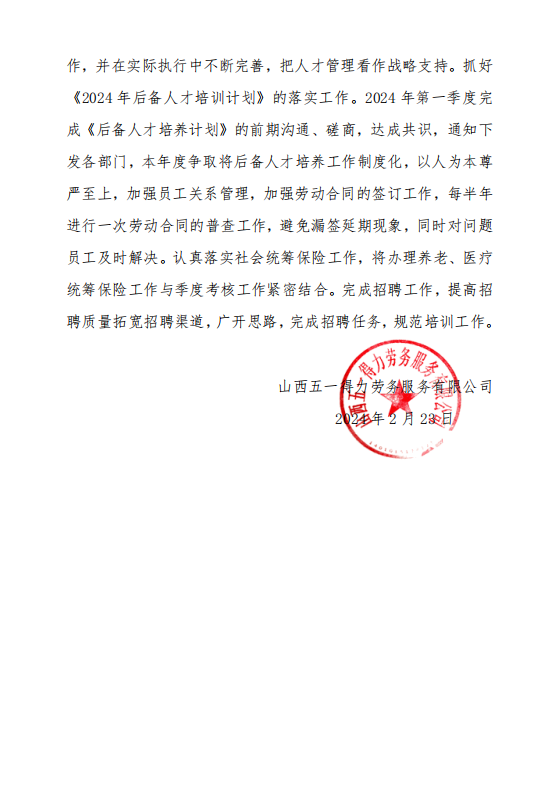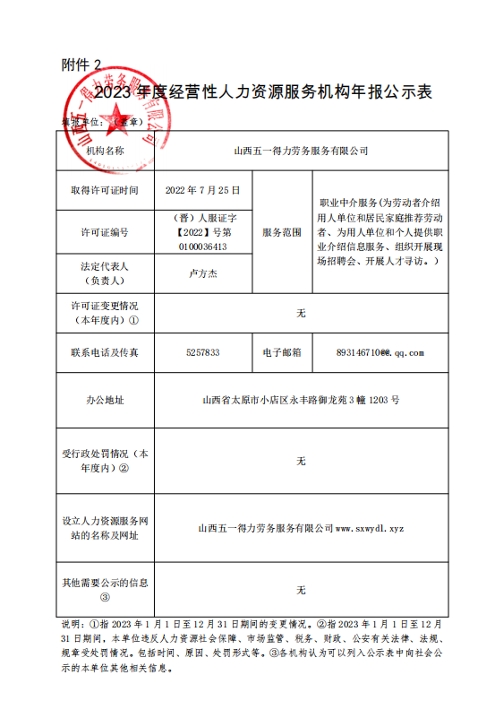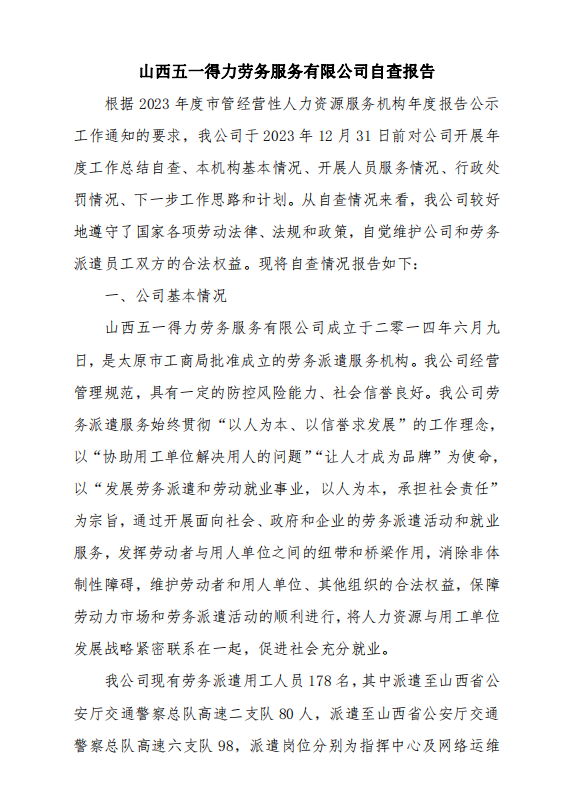 山西五一得力劳务服务有限公司于2023年12月31日前对公司展开年度工作总结自查,对本机构基本情况、人员服务情况、行政处罚情况进行了自查并制定下一步工作思路和计划。从自查情况来看,我公司较好地遵守了国家各项劳动法律、法规和政策,自觉维护公司和劳务派遣员工双方的合法权益。现将自查情况公示如下: